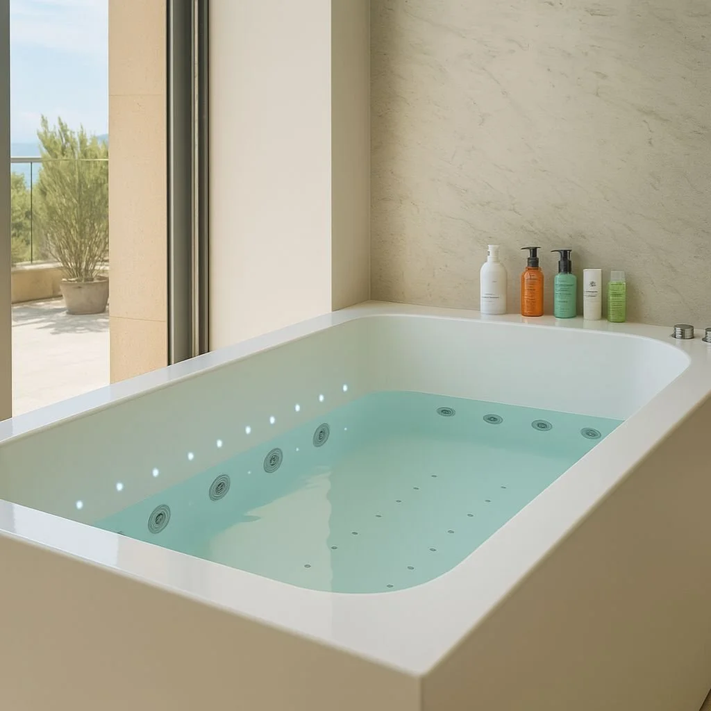 Our latest luxury bespoke spa hydrotherapy and chromotherapy bathtub system combines ‘eye catching’ elegance and performance. It has been designed to be either a free-standing solution or inset into a luxury bathroom.